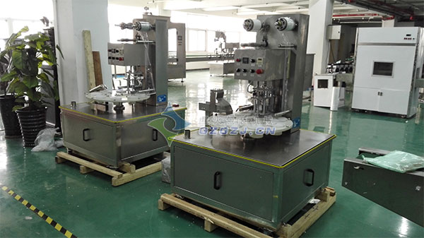 此款設備采用氣動式間隙運轉方式,電器采用可編程邏輯控制器,具有自動落杯、灌裝、色標定位、單道熱封、齒形切刀、自動對芯切邊及廢膜回收等功能。本機采用智能數字顯示溫度控制系統控制封口溫度,溫度誤差小于±1%。封口強度高,密封性好。整機采用德國可編程邏輯控制系統,機身采用不銹鋼設計,符合相關食品衛生標準。設備的執行零部件采用氣動控制系統,簡化了機械結構,封口質量極佳,大大地提高了設備的生產效率和使用壽命。